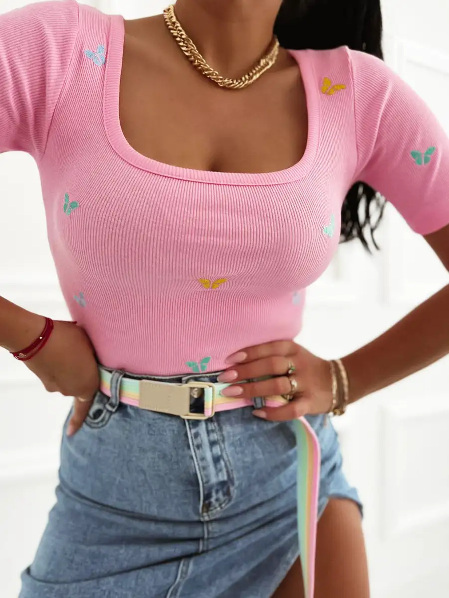 Bluzka o dopasowanym kroju, wykonana z elastycznego, prążkowanego materiału. Model z modnym, kwadratowym dekoltem oraz krótkim rękawem, który pięknie podkreśla sylwetkę. Całość zdobią subtelne, kolorowe hafty w kształcie motylków, dodające uroku i lekkości stylizacji.