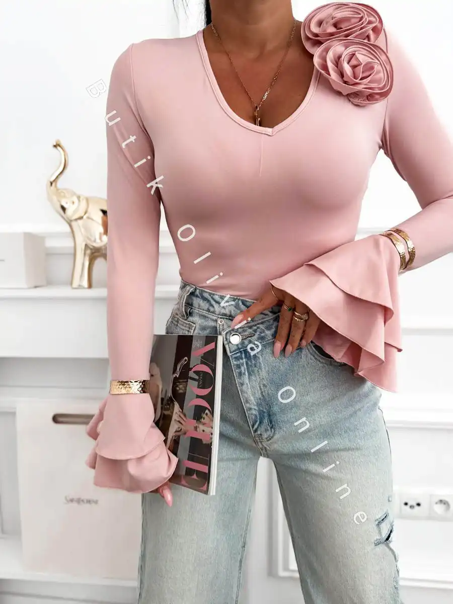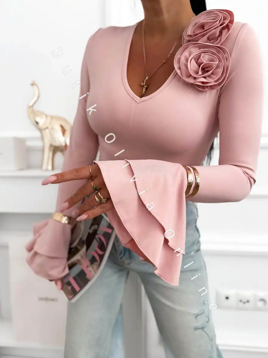 Różowa bluzka damska z efektowną aplikacją 3D to idealna propozycja dla kobiet, które kochają subtelne, a jednocześnie wyraziste stylizacje. Delikatny odcień różu dodaje lekkości i romantycznego charakteru, pięknie podkreślając kobiecą urodę. Model wyróżnia się dopasowanym krojem, który idealnie układa się na sylwetce, podkreślając jej atuty. Wykonana z przyjemnego w dotyku, elastycznego materiału, zapewnia komfort noszenia przez cały dzień. Bluzka posiada dekolt w kształcie litery V, który optycznie wysmukla szyję i dodaje elegancji. Największym elementem przyciągającym uwagę są ozdobne róże 3D na ramieniu, które nadają stylizacji wyjątkowego, modowego charakteru. Dodatkowym atutem są rozkloszowane rękawy zakończone falbaną, które wprowadzają lekkość i sprawiają, że całość prezentuje się niezwykle kobieco i stylowo.