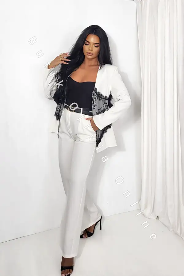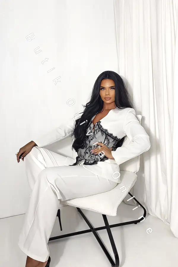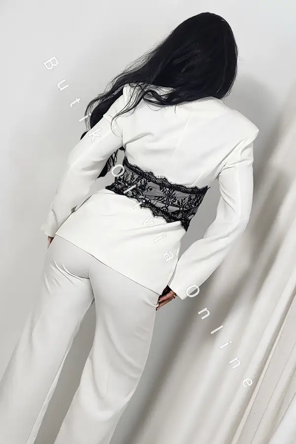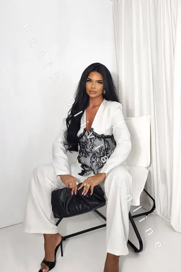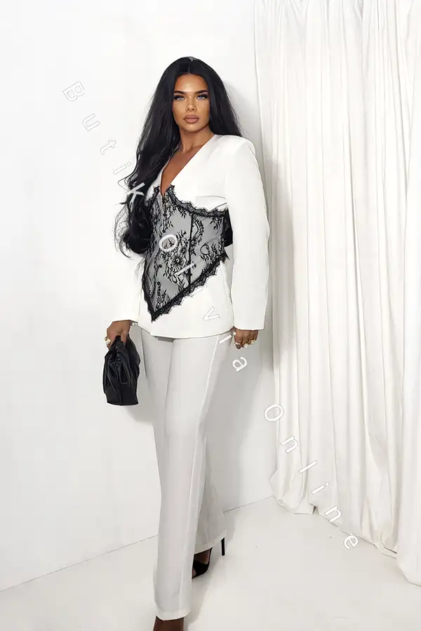 Jeśli szukasz czegoś, co wywoła prawdziwy efekt "wow" i sprawi, że wszystkie spojrzenia będą skierowane na Ciebie, ten garnitur jest stworzony właśnie dla Ciebie. To idealna propozycja dla kobiet pewnych siebie, które nie boją się modowych eksperymentów i lubią łączyć klasyczną elegancję z nutą pikanterii. Połączenie nieskazitelnej bieli garnituru z zmysłową, czarną koronką w formie wstawki imitującej gorset to odważne i niezwykle kobiece rozwiązanie. Marynarka o dopasowanym kroju po mistrzowsku podkreśla talię, modelując sylwetkę, podczas gdy długie, szerokie spodnie optycznie wydłużają nogi, dodając całej stylizacji lekkości i nowoczesnego sznytu. Kontrastowe zestawienie kolorów i faktur – gładkiego materiału z misterną koronką – nadaje kompletowi unikalny, luksusowy charakter.