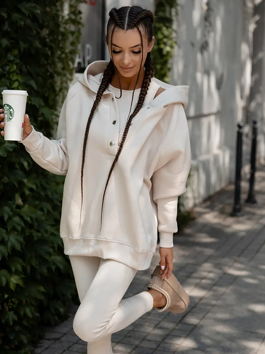 Minimalizm i moda w codziennym wydaniu. Beżowy komplet to idealna propozycja dla kobiet, które cenią stonowane kolory i ponadczasowy styl. Bluza oversize, dopasowane legginsy prążkowane i top tworzą spójną, wygodną stylizację na każdą okazję.