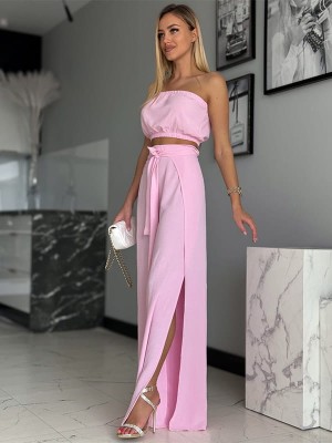 Wprowadź do swojej garderoby nutę subtelnej elegancji z pudrowo-różowym kompletem damskim. Zestaw tworzy lekki top bez ramiączek, który podkreśla linię ramion i dodaje dziewczęcego uroku. Do kompletu dołączone są szerokie spodnie z wysokim stanem z ozdobnym paskiem wiązanym w talii, które pięknie wysmuklają sylwetkę. Stylowe rozcięcia po bokach nogawek dodają lekkości i sprawiają, że komplet świetnie sprawdzi się w ciepłe, letnie dni. To idealna propozycja na romantyczne spacery, wakacyjne wyjścia czy stylowe letnie przyjęcia.