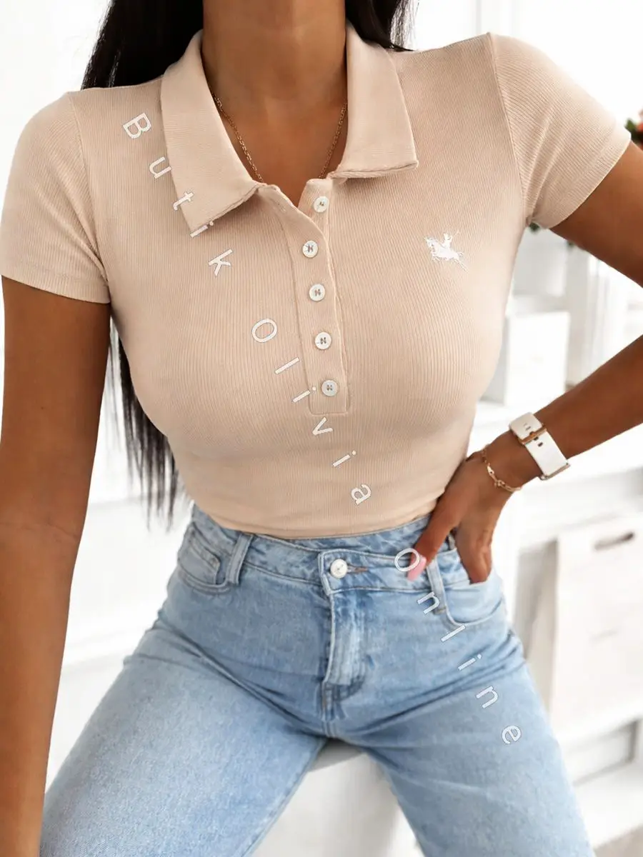 Prążkowany t-shirt z kołnierzykiem i dekoltem zapinanym na guziki to połączenie wygody i kobiecego stylu. Dopasowany fason pięknie podkreśla sylwetkę, a elastyczny materiał świetnie układa się na ciele. To model, który idealnie sprawdzi się zarówno na co dzień, jak i w bardziej stylowych casualowych outfitach.