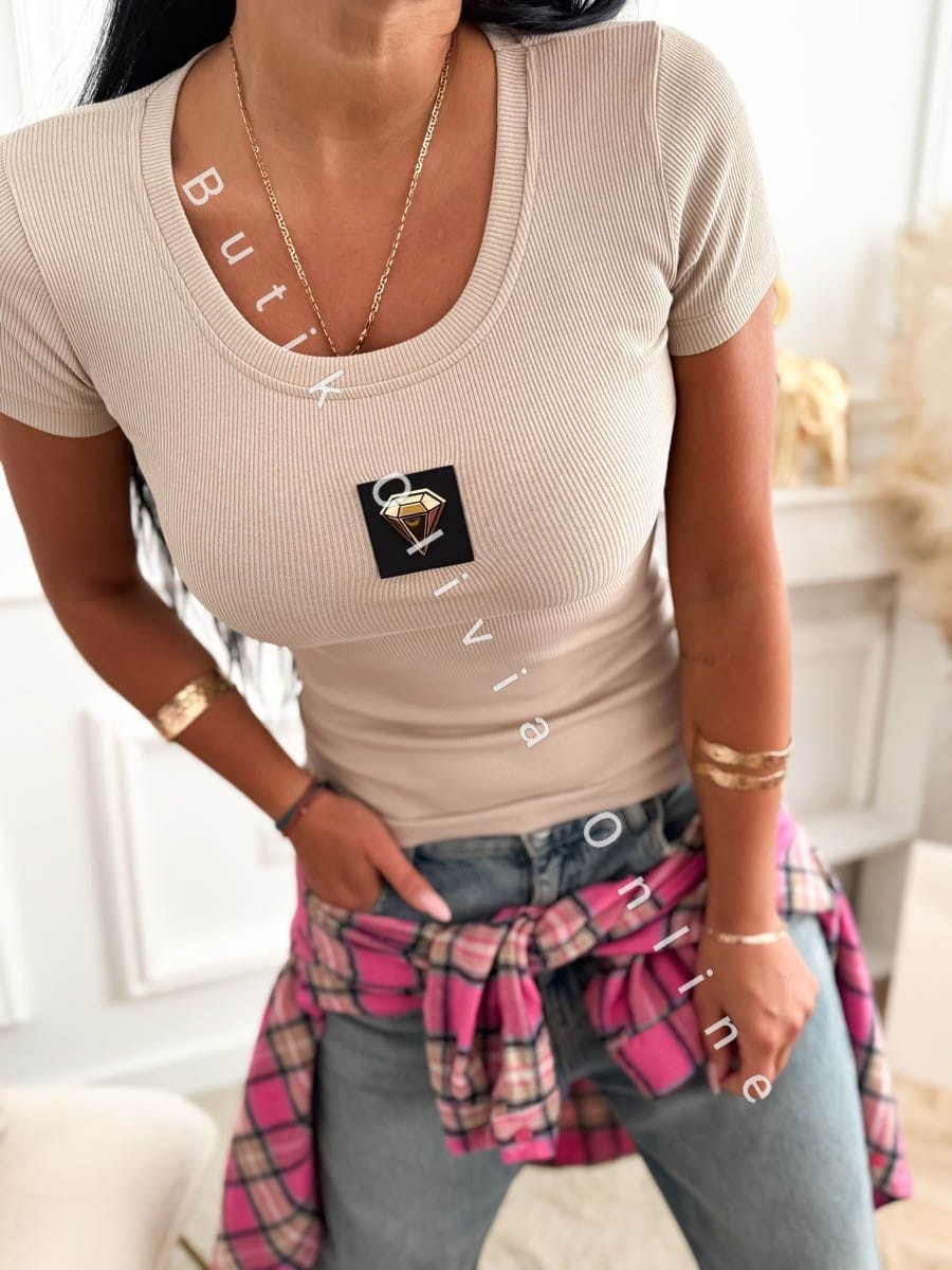 T-shirt prążkowany z diamentem VERTO - beżowy